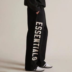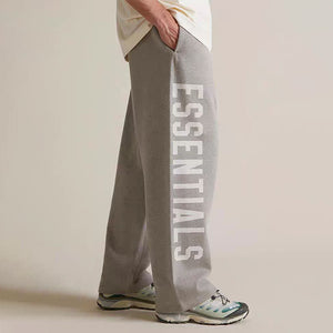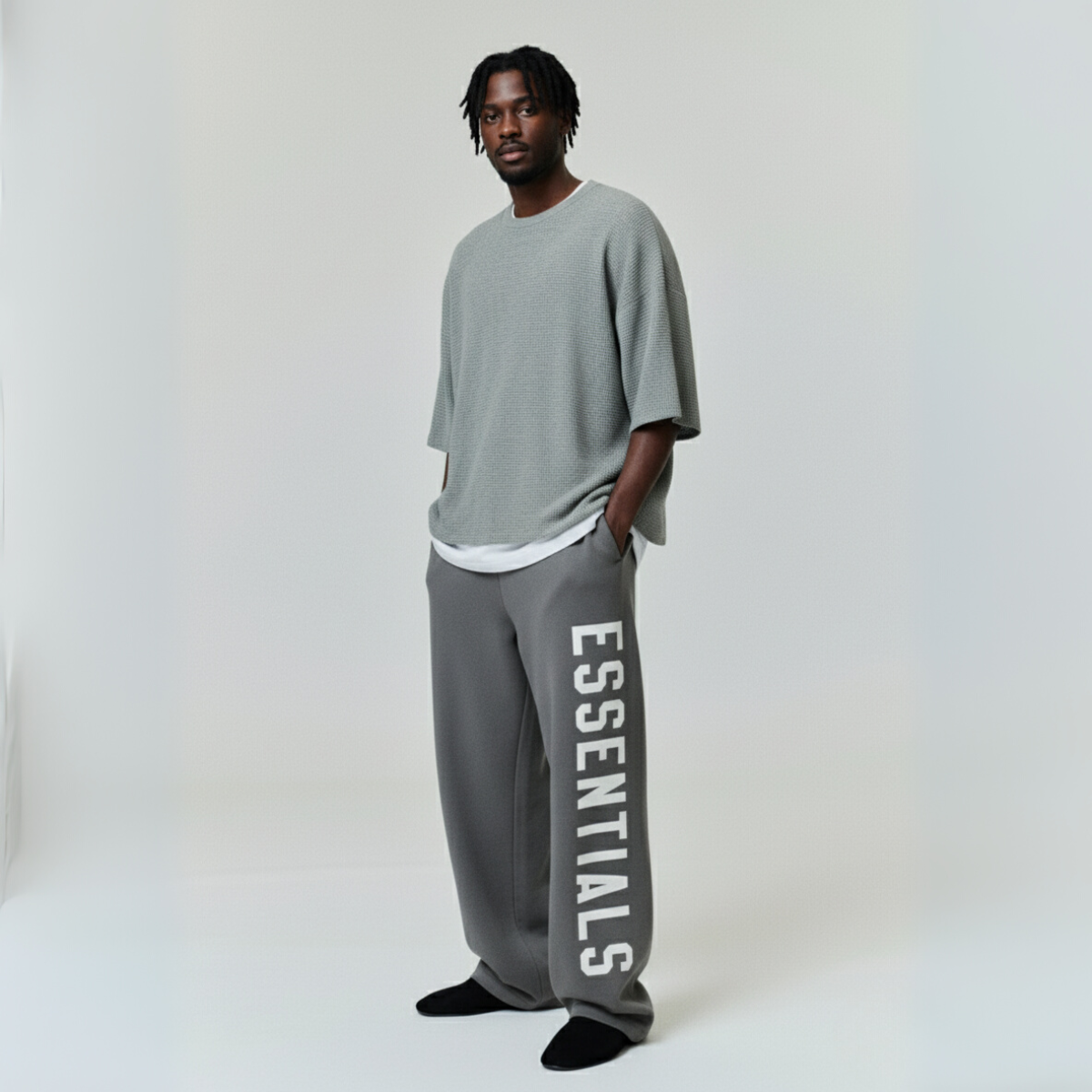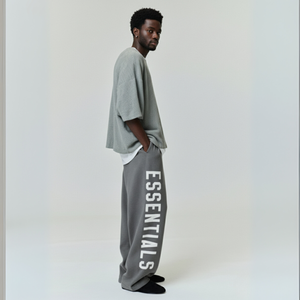 - Bold Graphic Detail: Large ESSENTIALS print down the leg adds a statement element to an otherwise clean silhouette.