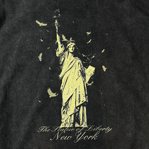 The Siggnia Liberty Washed Graphic Tee pays tribute to New York’s cultural icon with a bold digital print of the Statue of Liberty. Washed for a vintage streetwear feel, this oversized tee blends urban attitude with timeless symbolism.