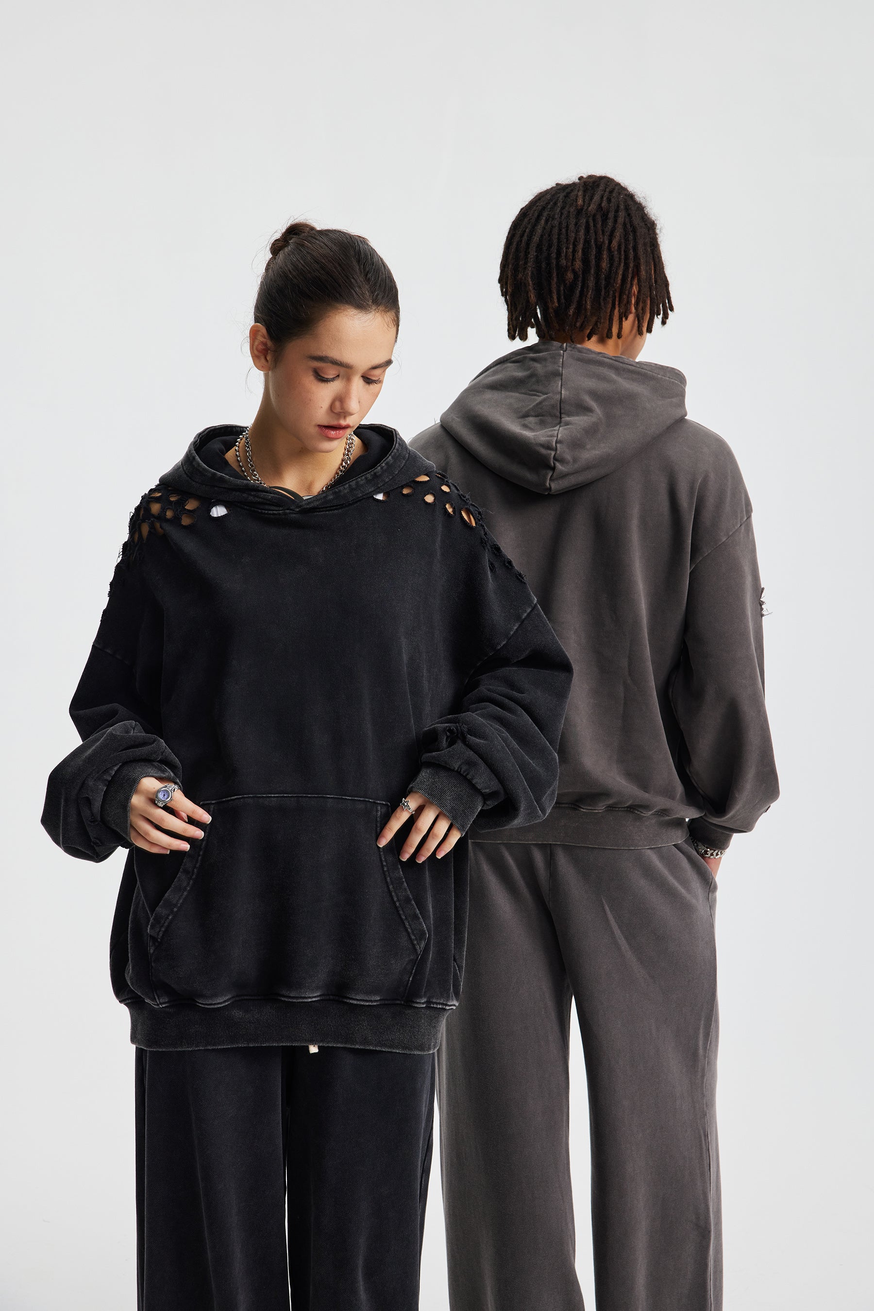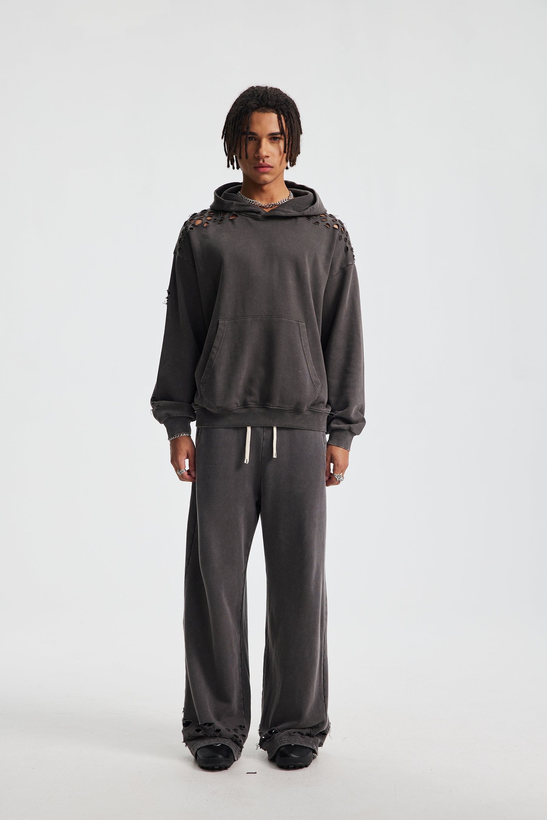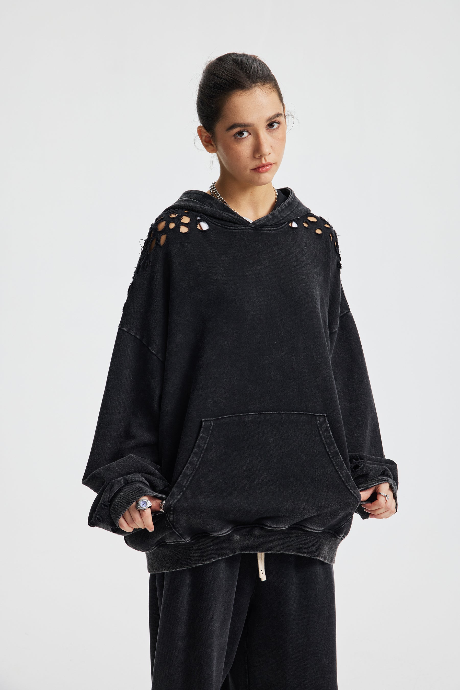 Introducing the Siggnia Obscura Distressed Hoodie, a bold expression of modern streetwear minimalism. Crafted from 380g heavyweight cotton, this hoodie features an exclusive snow-wash faded finish combined with strategic distressed detailing for a raw, textured aesthetic. Designed with an oversized silhouette, it blends premium comfort with elevated street styling for an effortlessly modern look.